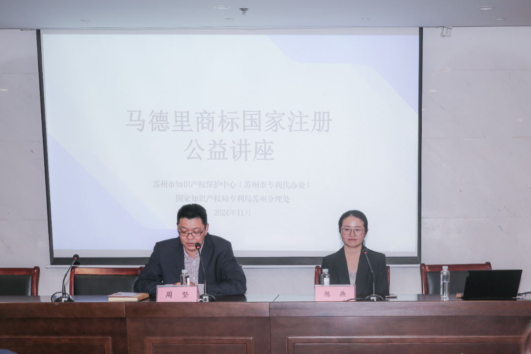 11月12日下午,苏州市知识产权保护中心举办马德里商标国际注册公益讲座。此次讲座邀请了江苏省宁海商标事务所陈燕副所长进行授课,相关企事业单位、科研院所及知识产权从业人员50余人参加。保护中心副主任周坚出席并主持会议。